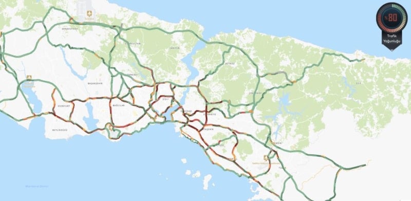İBB yoğunluk haritası trafik seyrinin yüzde 80'e dayandığını gösterdi.