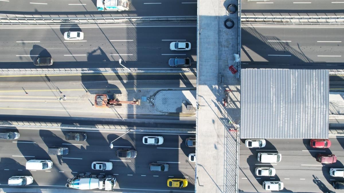Proje nedeniyle şerit kapatılması sonrası trafikte meydana gelen yoğunlukla da gündeme gelen çalışmada üst geçitteki son durum havadan görüntülendi.