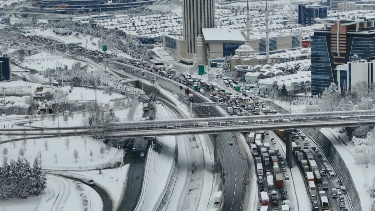 İSTOÇ mevkiinde kar nedeniyle yüzlerce aracın bekleyişi havadan görüntülendi