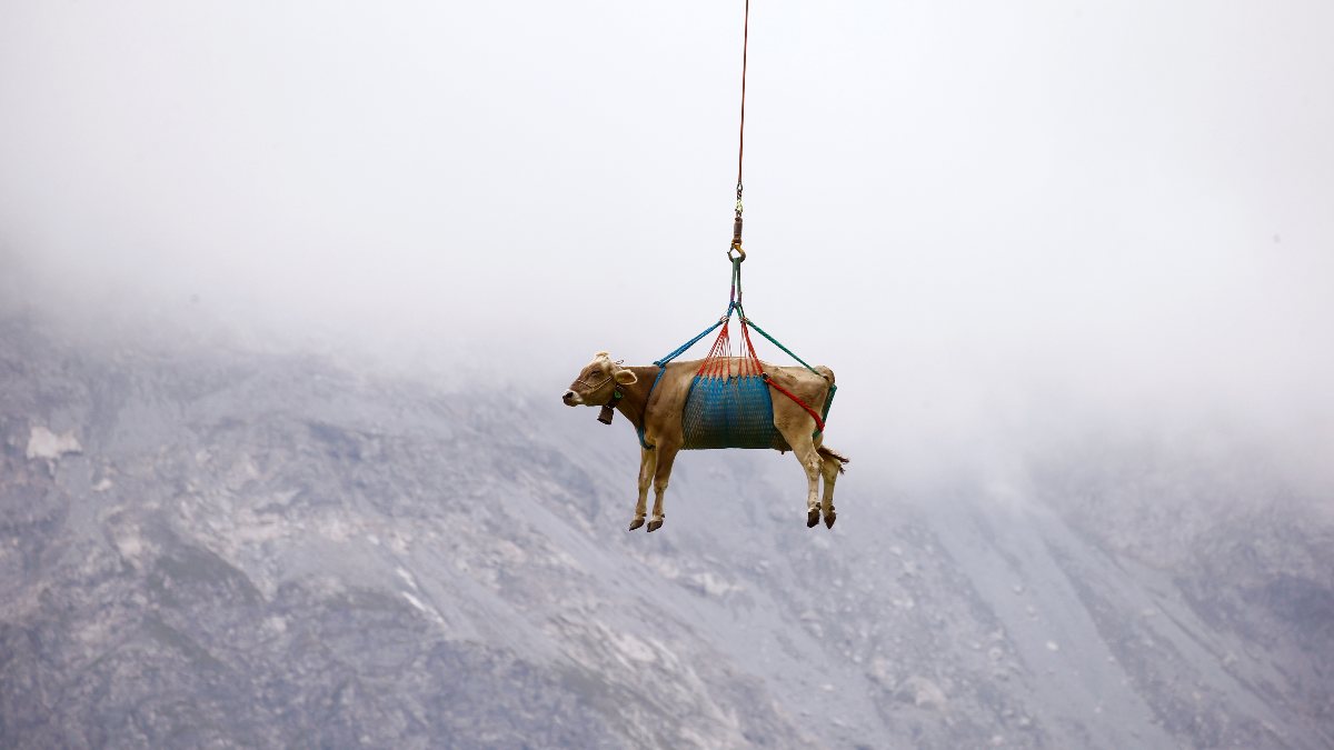 İsviçre'de yaralanan inekler, helikopterle meradan alındı VİDEO