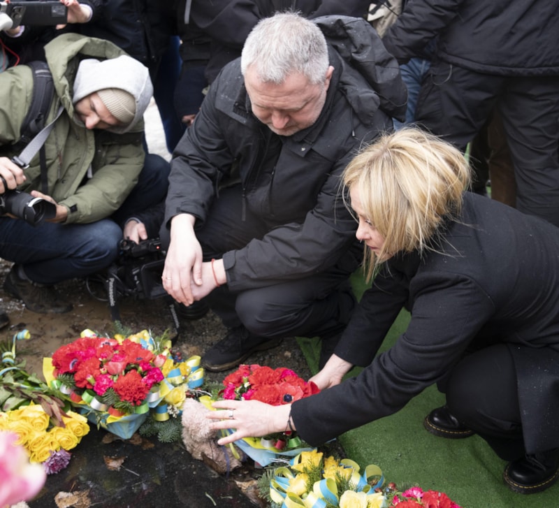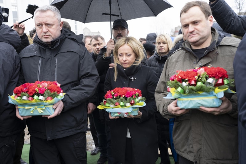 Meloni, Irpin'de Rus saldırılarında hayatını kaybedenlerin anısına kurulan anıta çiçek bıraktı.
