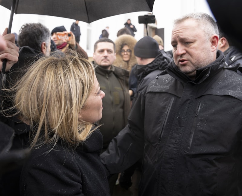 Meloni, tren istasyonunda Ukrayna Dışişleri Bakan Yardımcısı Yevhen Perebyinis tarafından çiçekle karşılandı.