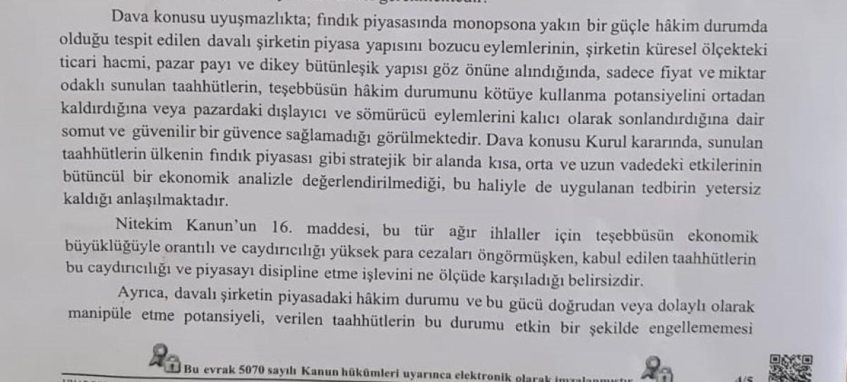 Mahkeme, Ferrero’nun Rekabet Kurumu’na 2024 yılında sunduğu ve "fındığı devletin açıkladığı fiyatın altına almayacağız" içerikli taahhütlerini yetersiz buldu.