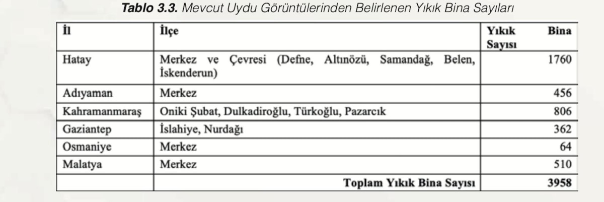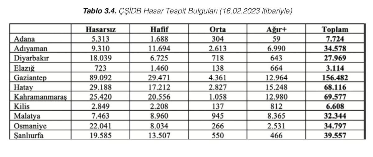 Raporda, depremler sonrasında Çevre, Şehircilik ve İklim Değişikliği Bakanlığı tarafından toplam 13 ilde yürütülen hasar tespit çalışmaları kapsamında 16 Şubat itibarıyla 61 bin 722 binada yer alan 263 bin 800 bağımsız birimin acil yıkılması gereken, ağır hasarlı ve yıkık olduğunun ifade edildiği belirtildi.