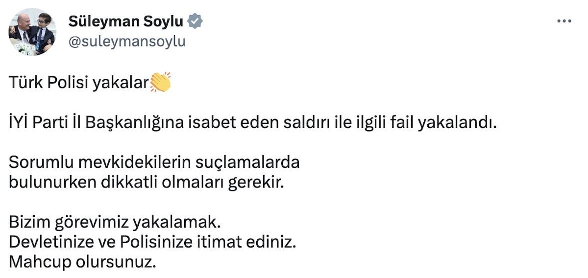 Süleyman Soylu paylaşımında faillerin kısa sürede yakalacağını belirtti.