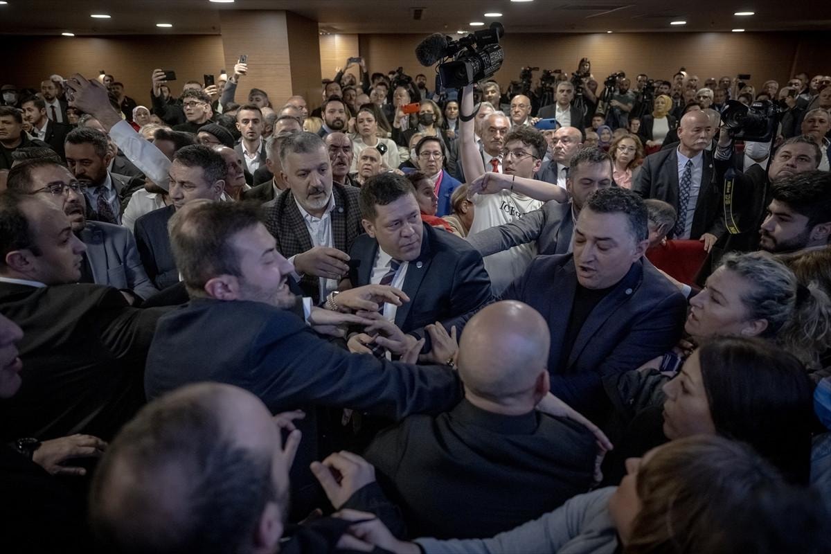 O esnada salonda bulunan İyi Parti Genel Başkanı Meral Akşener'in, yaşanan kavganın ardından öfkeli bir şekilde salondan ayrıldığı belirtildi.