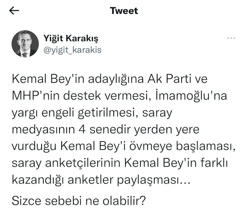 Kemal Bey'in adaylığına AK Parti ve MHP'nin destek vermesi, İmamoğlu'na yargı engeli getirilmesi, saray medyasının 4 senedir yerden yere vurduğu Kemal Bey'i övmeye başlaması, saray anketçilerinin Kemal Bey'in farklı kazandığı anketler paylaşması. Sizce sebebi ne olabilir?