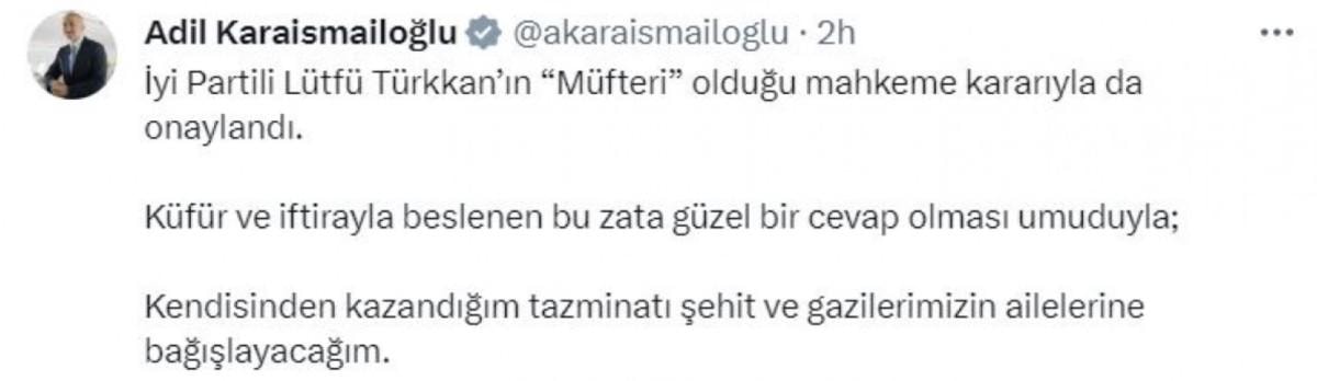 Karaismailoğlu, Twitter'daki hesabından yaptığı açıklamada, "İyi Partili Lütfü Türkkan'ın müfteri olduğu mahkeme kararıyla da onaylandı. Küfür ve iftirayla beslenen bu zata güzel bir cevap olması umuduyla; kendisinden kazandığım tazminatı şehit ve gazilerimizin ailelerine bağışlayacağım." dedi.