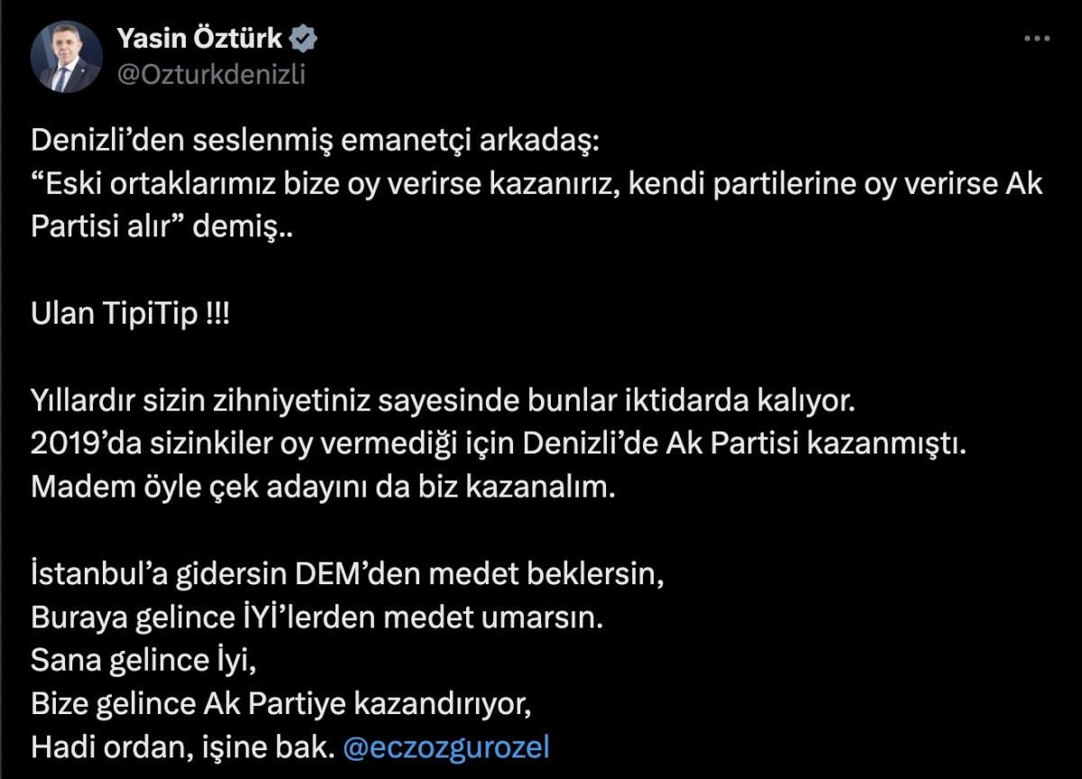 Özel için "Ulan TipiTip!!!" ifadesini kullanan Öztürk, "Yıllardır sizin zihniyetiniz sayesinde bunlar iktidarda kalıyor. 2019’da sizinkiler oy vermediği için Denizli’de AK Partisi kazanmıştı. Madem öyle çek adayını da biz kazanalım" dedi.