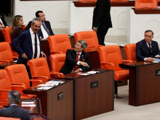 İYİ Parti Kayseri Milletvekili Yusuf Halaçoğlu, Meclis sıralarında partisinin isminin yazıp yazmadığını kontrol ediyor.