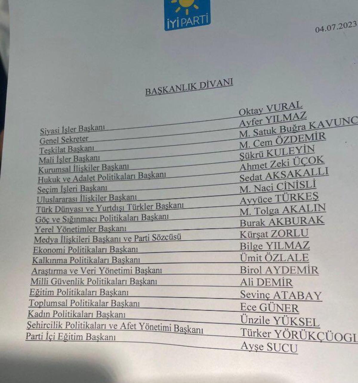 İyi Parti'ye katılan eski Ulaştırma Bakanı ve MHP Grup Başkanvekili Oktay Vural Siyasi İşler Başkanı, eski Devlet Bakanlarından Ayfer Yılmaz Genel Sekreter, MHP'nin kurucu Genel Başkanı Alparslan Türkeş'in kızı Ayyüce Türkeş Türk Dünyası ve Yurt Dışı Türkler Başkanı olurken geçen yıl Akşener'e bağlanan Teşkilat Başkanlığı, Buğra Kavuncu başkanlığında yeniden düzenlendi.
