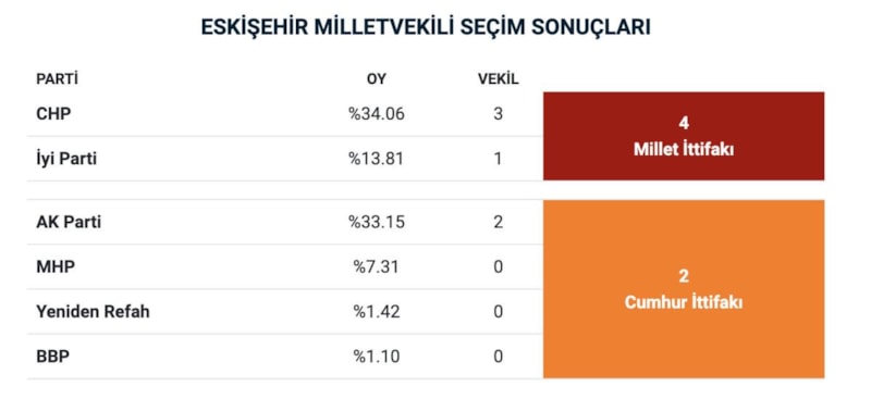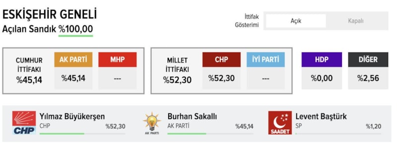 Genel seçimlerde CHP yüzde 34,41 oy alırken, AK Parti 32,76, İyi Parti 14,16, MHP ise 7,18 oy almıştı.