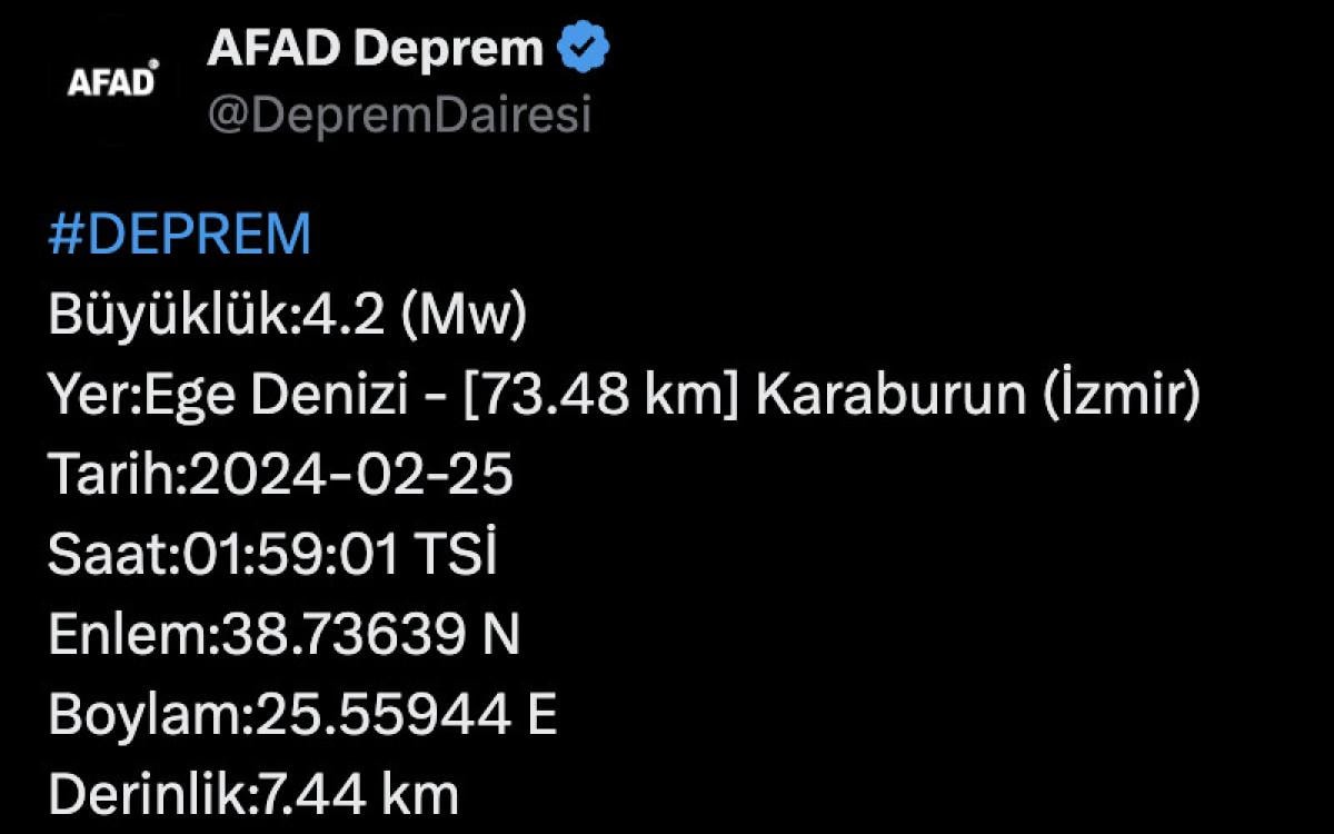 Sarsıntının merkez üssünün İzmir'in Karaburun ilçesine uzaklığı 73 kilometre olarak ölçüldü.