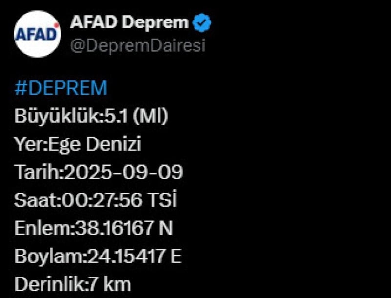 Afet ve Acil Durum Yönetimi Başkanlığı'nın internet sitesinde yer alan bilgiye göre saat 00.27'de merkez üssü Ege Denizi olan 5.1 büyüklüğünde sarsıntı kaydedildi.