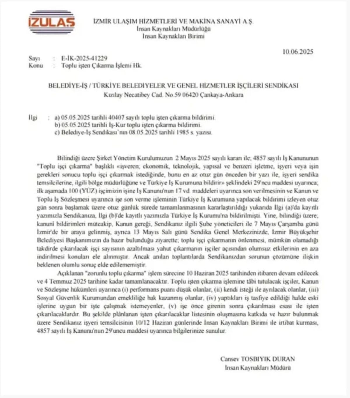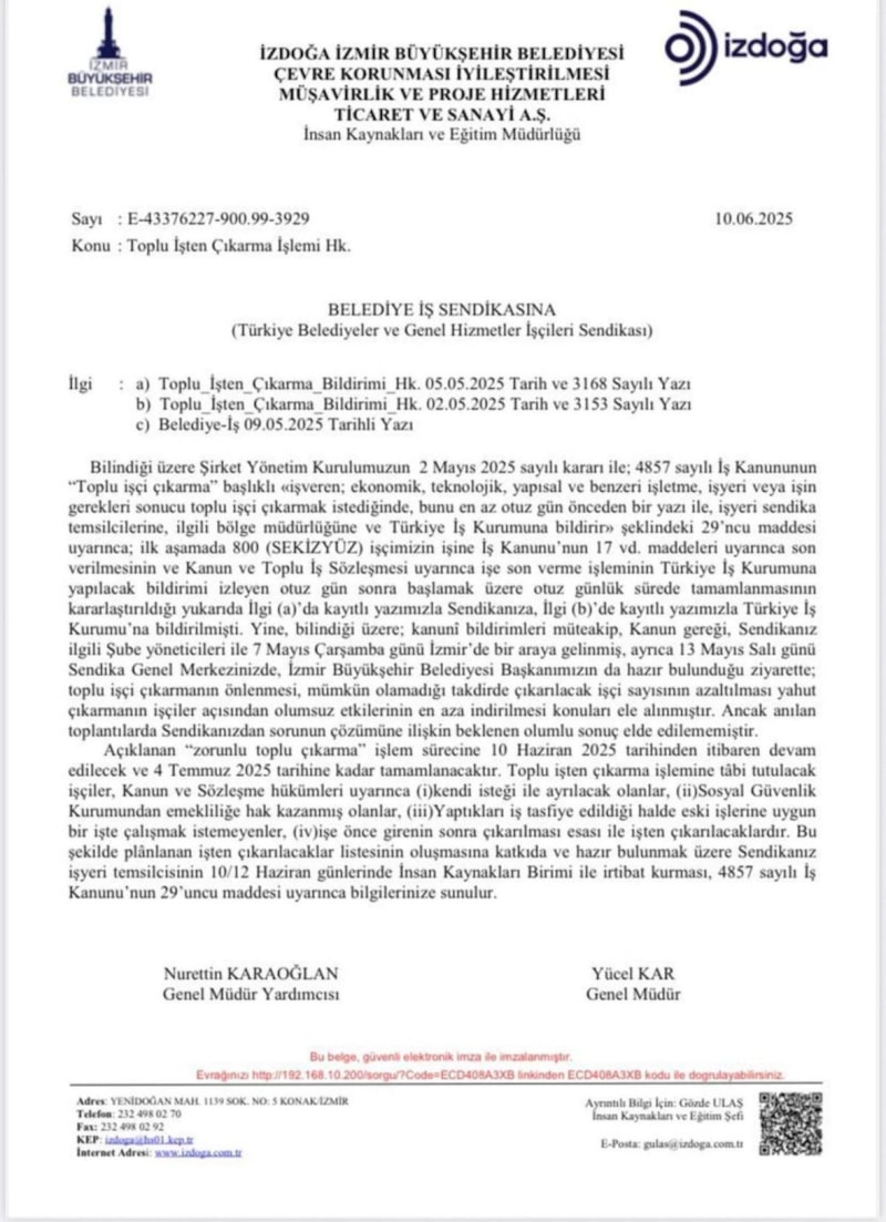 İZDOĞA'nın gönderdiği yazıya göre, 10 Haziran’da başlayan işten çıkarma süreci 4 Temmuz 2025’e kadar tamamlanacak.
