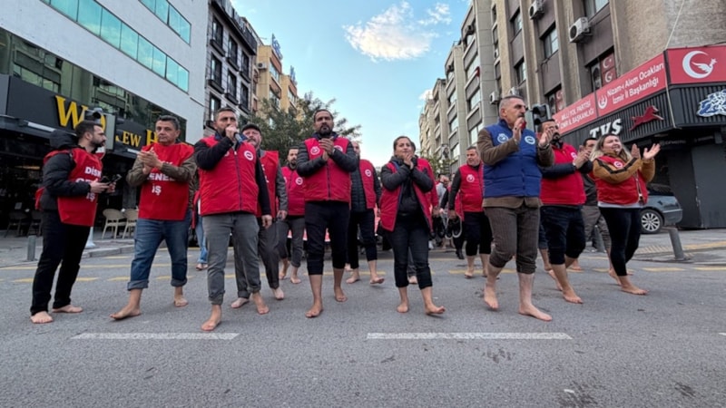 Genel İş İzmir Şubeleri binası önünde bir araya gelen işçiler, "Çıplak maaşa karşı çıplak ayak ile yürüyoruz" pankartı açtı, slogan attı.