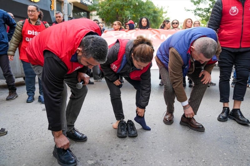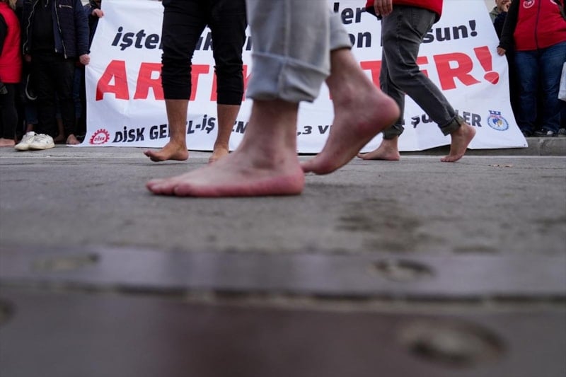 İşçiler, ayakkabılarını ve çoraplarını çıkararak Mürselpaşa Bulvarı'ndan Kültürpark 9 Eylül Kapısı'na kadar yürüdü.