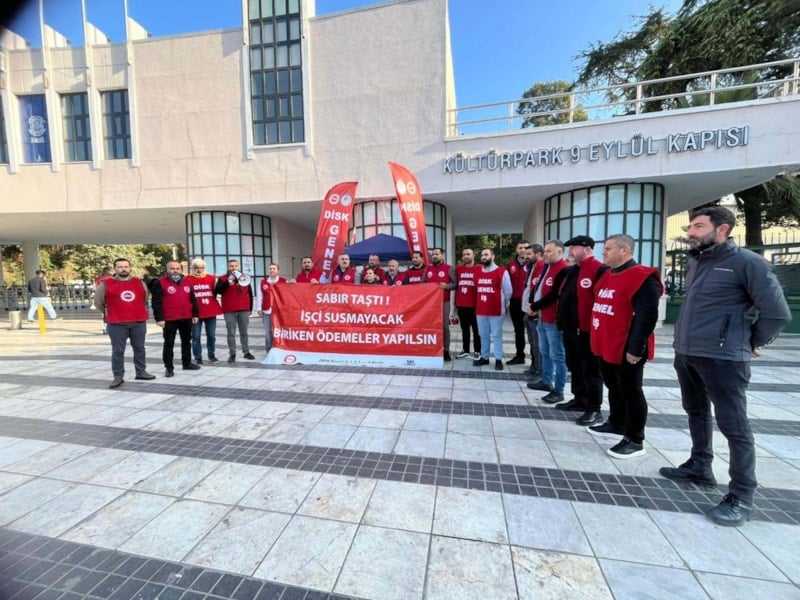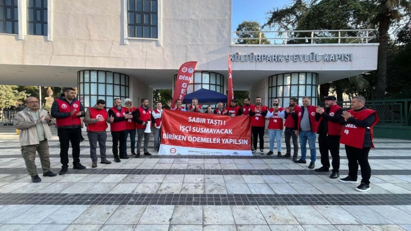 Kültürpark'taki 9 Eylül kapısında bir araya gelen temsilciler ve çalışanlar sloganlar attı.