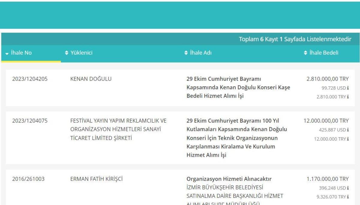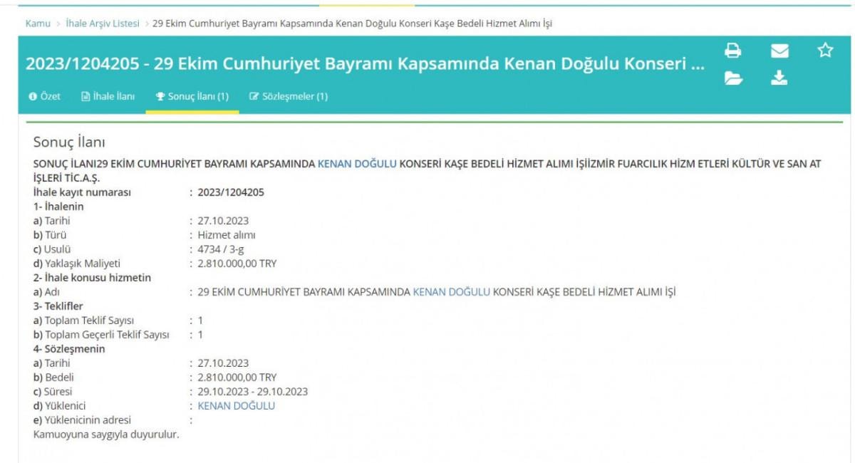 Bu ihalelerden ilki, '29 Ekim Cumhuriyet Bayramı 100. Yıl kutlamaları kapsamında Kenan Doğulu konseri için teknik organizasyonun karşılanması kiralama ve kurulum’ başlığıyla gerçekleştirildi.