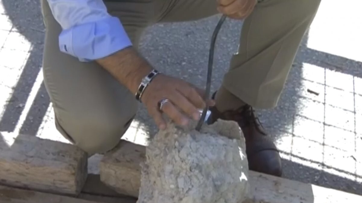 Nihat Şen, binadan alınan beton parçasını eliyle ovaladı ve betonun anında ufalandığı görüldü.