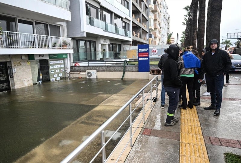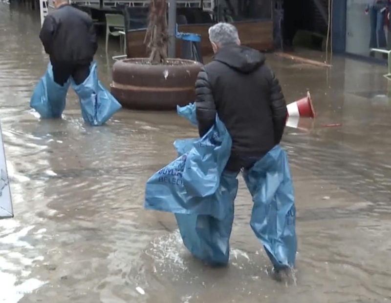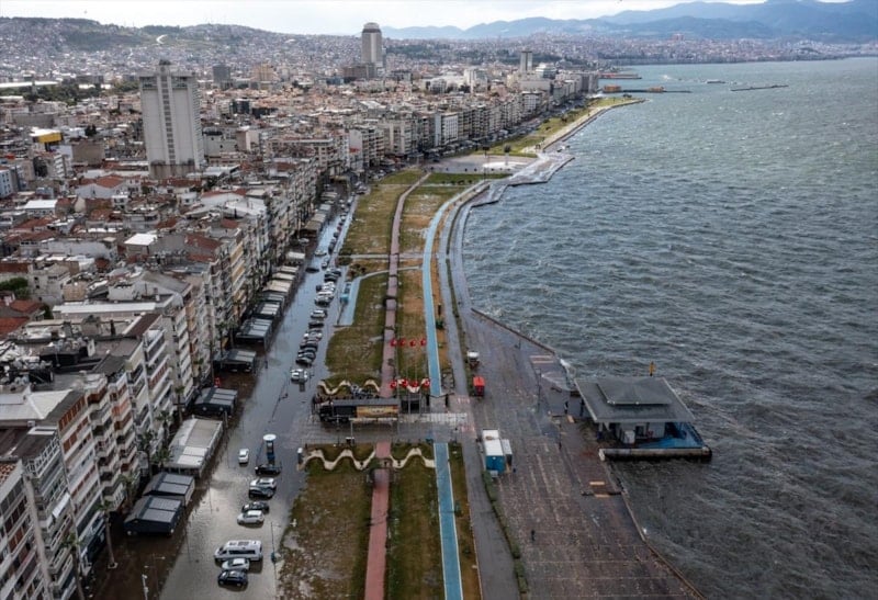 İzmir'in Karşıyaka ve Konak ilçelerinde yoğun yağışın ardından deniz taştı, yollar su altında kaldı, çok sayıda iş yeri, apartman ve dükkanı su bastı.