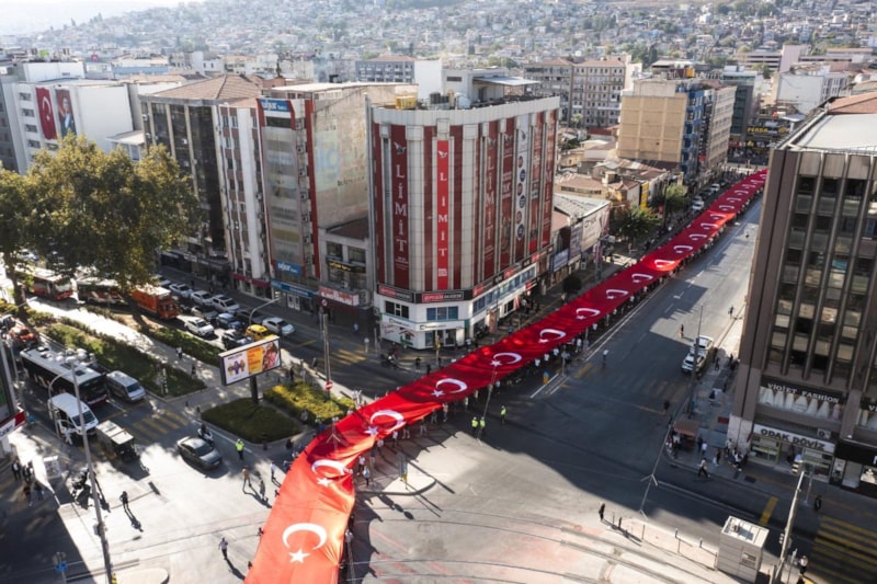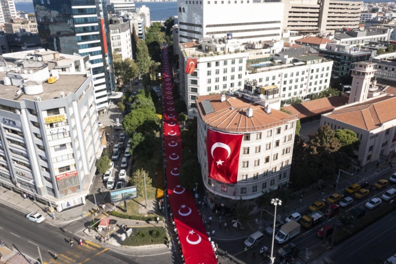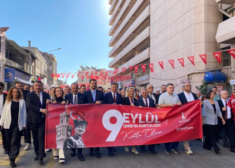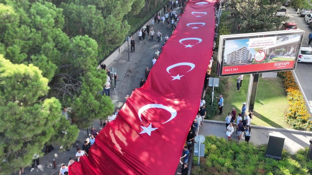 Anafartalar Caddesi ile Cumhuriyet Meydanı arasında geçen yürüyüşte 350 metrelik dev Türk bayrağı taşınırken 7'den 70'e İzmirliler, yol kenarlarından da Türk bayrakları sallayıp, kentin kurtuluşunu kutladı.