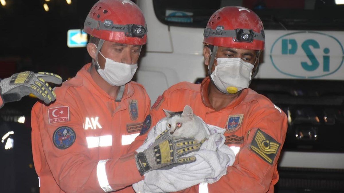 Çalışmalar kapsamında, Bayraklı ilçesindeki Rıza Bey Apartmanı'nın çökmesiyle enkaz altında kalan kedi, arama-kurtarma ekiplerince fark edildi.