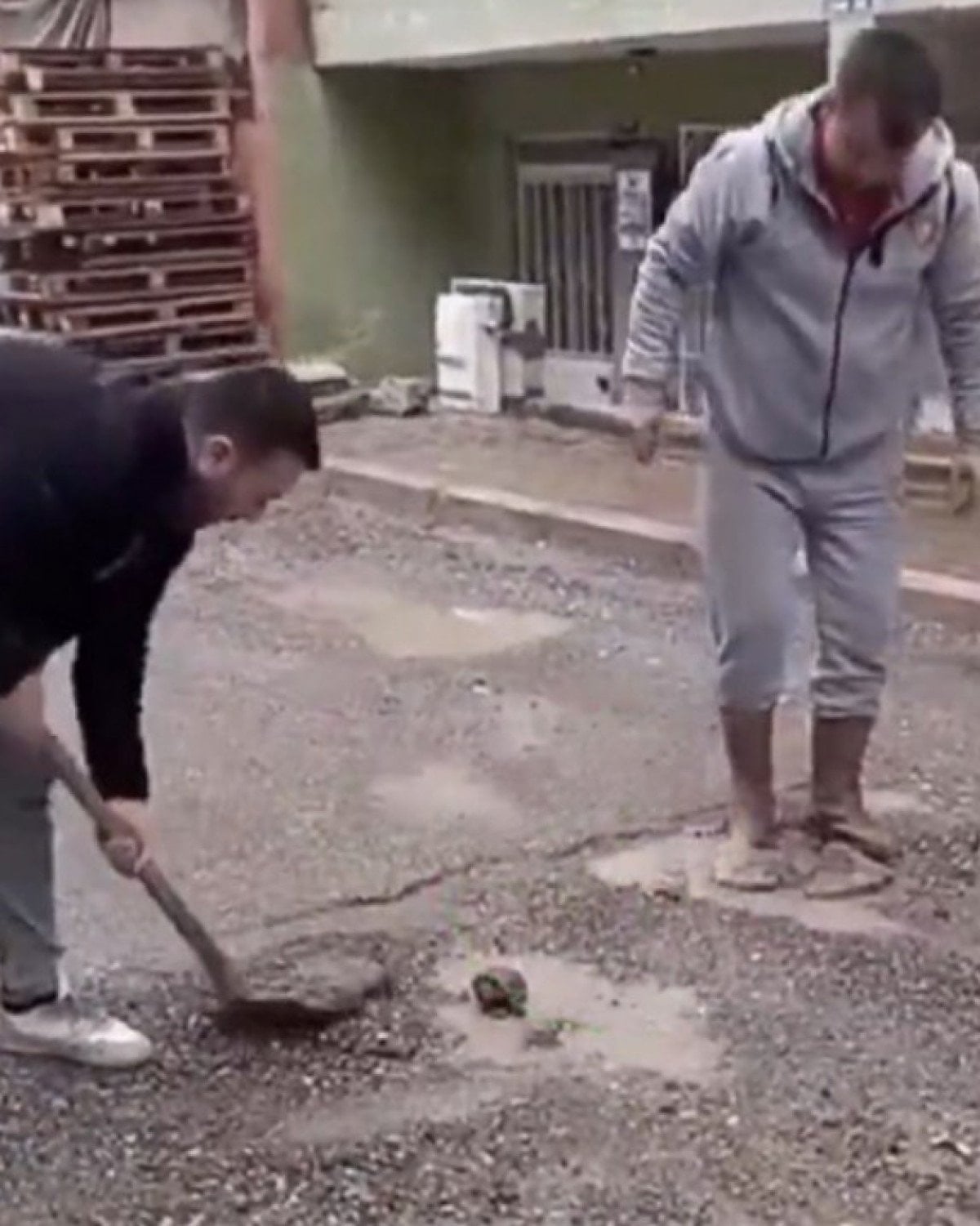 - Şikayetlere rağmen belediyeden geri dönüş alamayan vatandaşlar kazma kürekle yolları onarıyorlar.