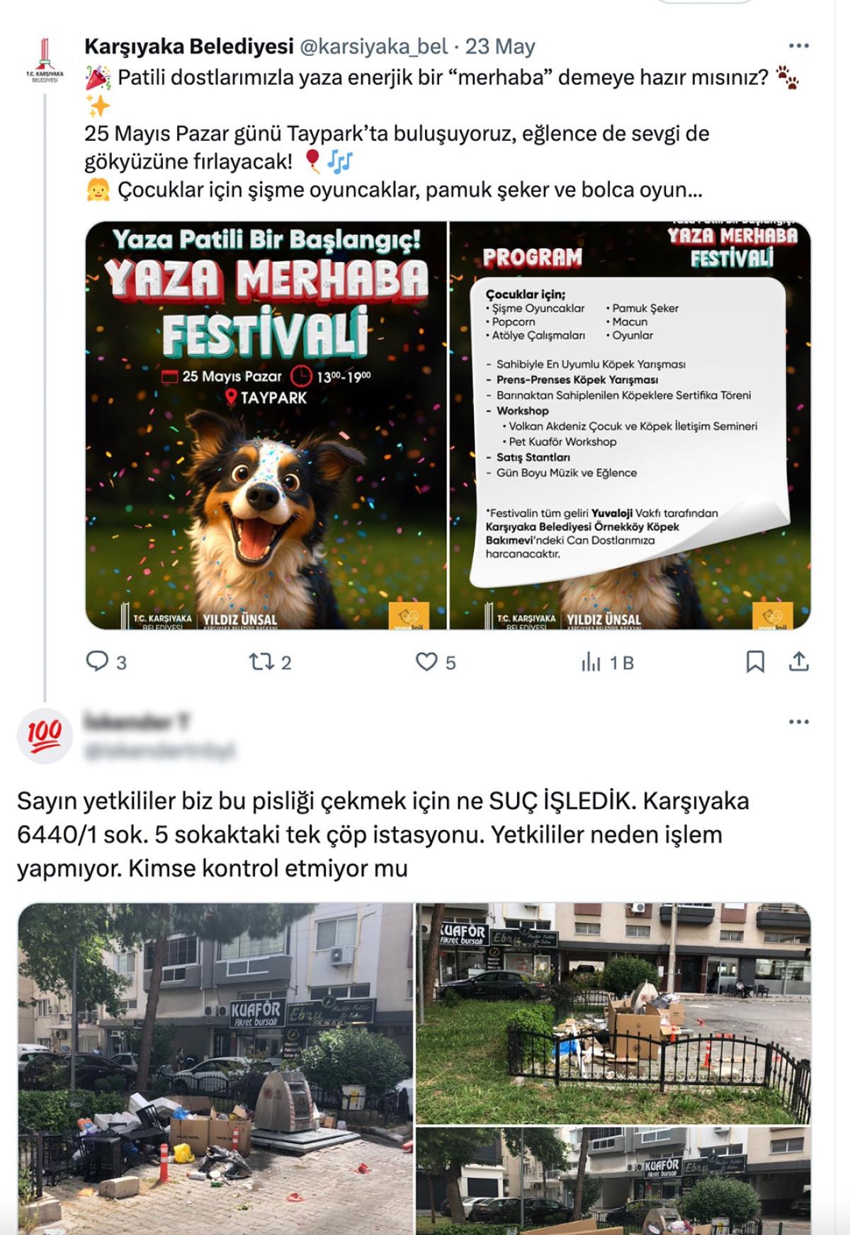 Karşıyaka Belediyesi'nin "Patili dostlarımızla yaza enerjik bir “merhaba” demeye hazır mısınız? 25 Mayıs Pazar günü Taypark’ta buluşuyoruz, eğlence de sevgi de gökyüzüne fırlayacak! Çocuklar için şişme oyuncaklar, pamuk şeker ve bolca oyun..." afişini paylaşmasına sinirlenen vatandaşlar, çöp dağlarını tweet'in altına eklemeye başladı.