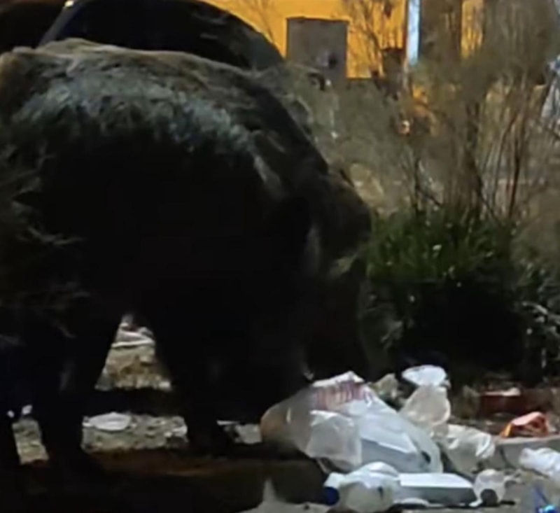 Çöp kutularının olduğu bir noktada zamanında toplanmayan çöpler, domuzların ilgisini çekerken, o anlar bir vatandaş tarafından cep telefonuyla kaydedildi.