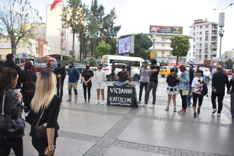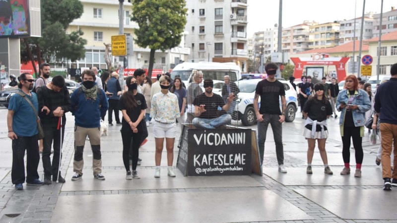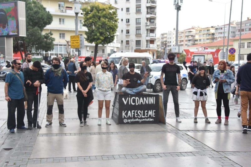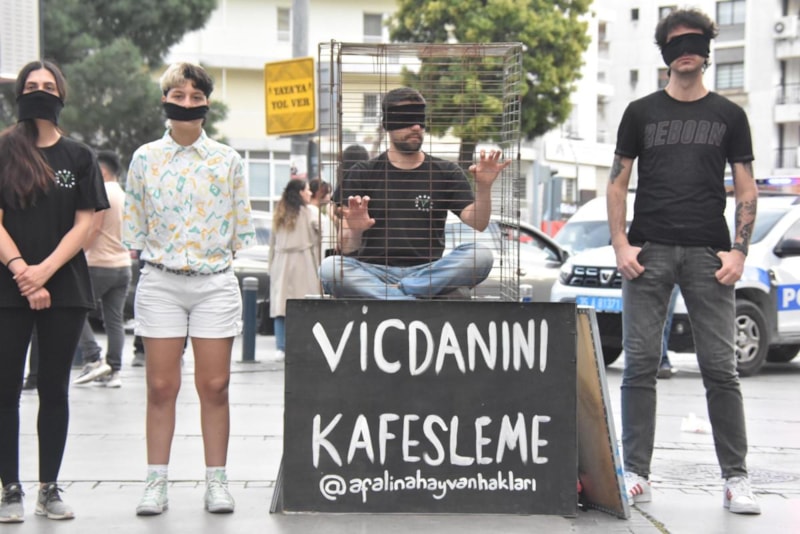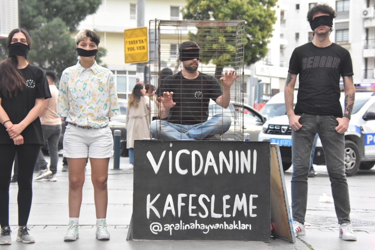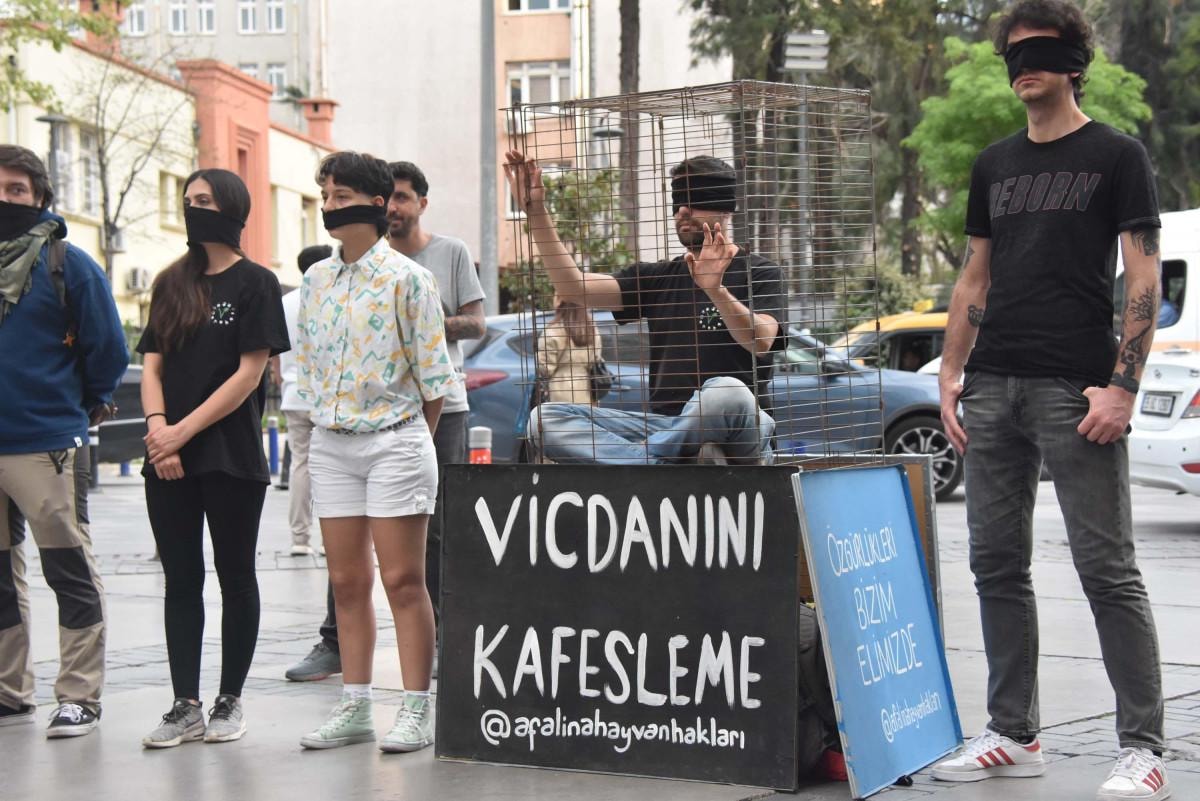 Sokak hayvanlarının gördüğü işkence ve barınaklardaki dikkat çekmek için bir araya gelen hayvanseverler, ağızlarına bandaj bağlayarak ve önünde 'Vicdanımı Kafesleme' yazan kafesin içine kendini hapsederek tepki gösterdi.