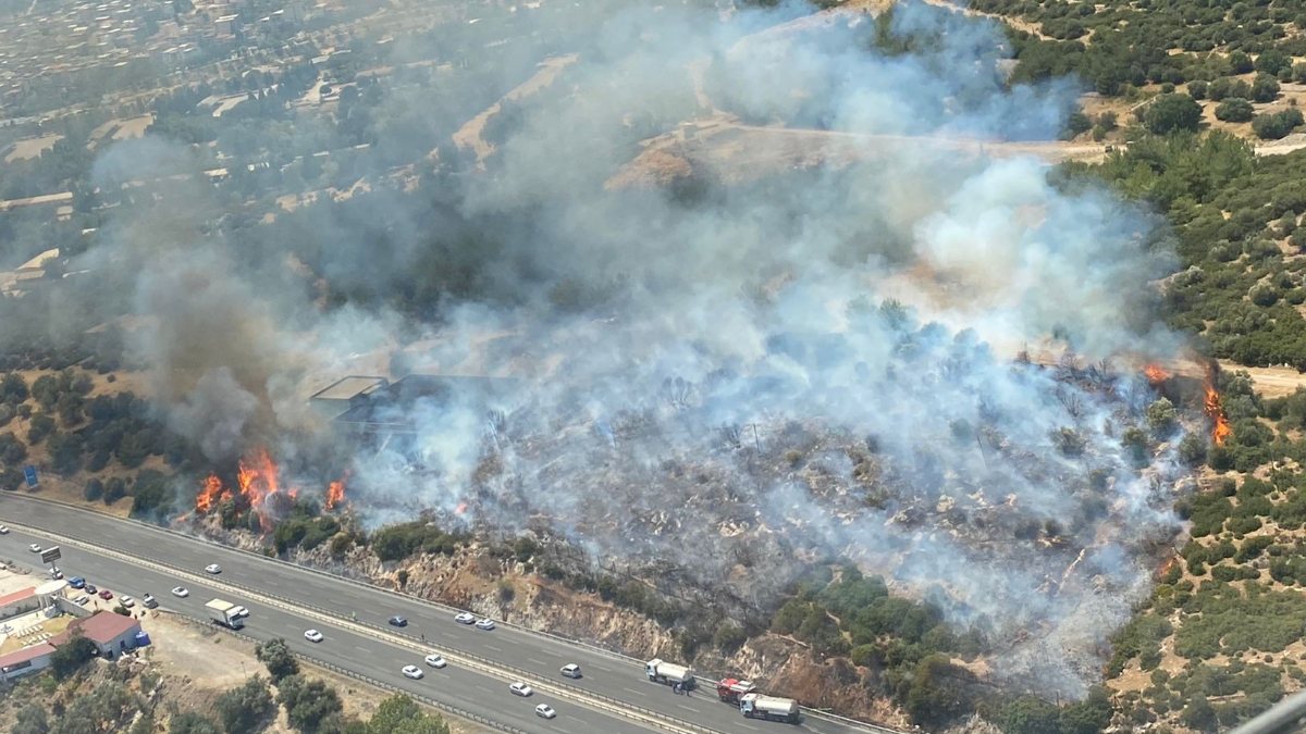 Yangına İzmir Orman Bölge Müdürlüğü ekipleri 3 helikopter ile havadan, 9 arazöz ile karadan müdahale ederken, itfaiye ekipleri de söndürme çalışmalarına destek veriyor.