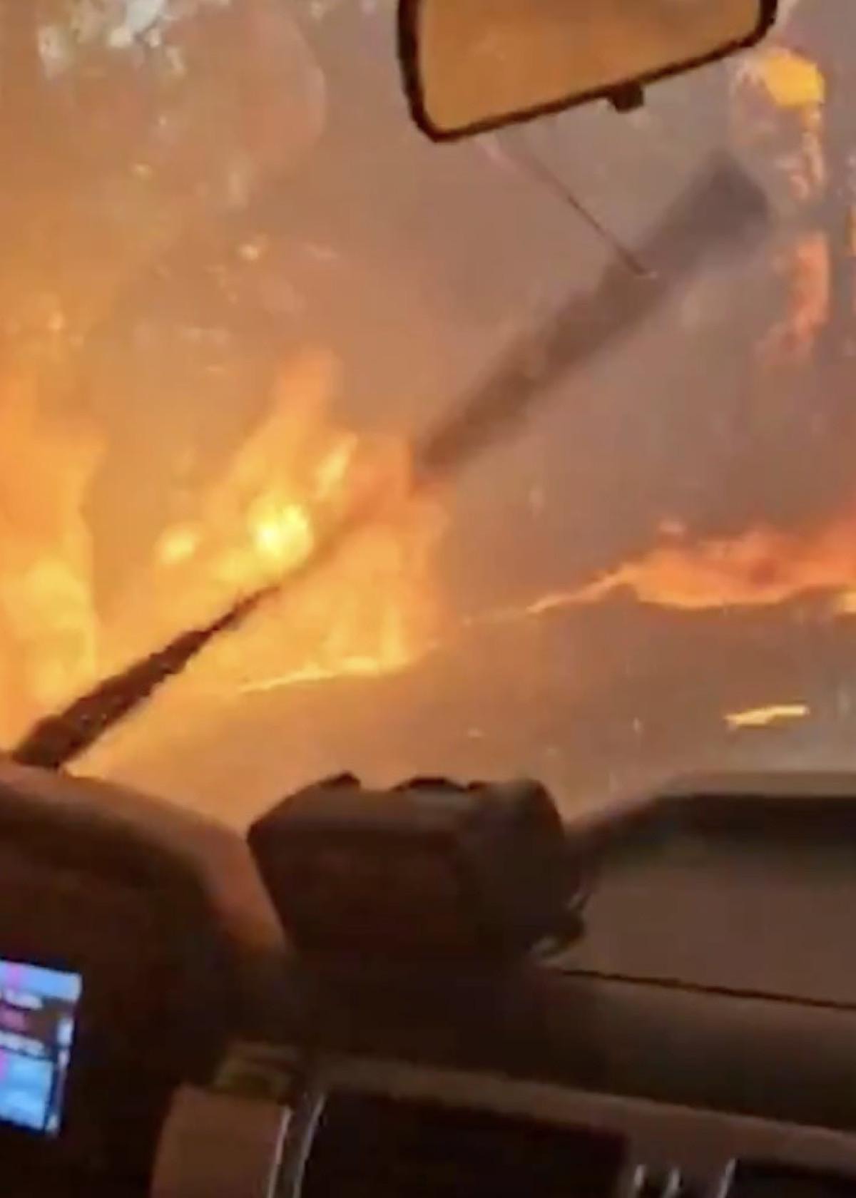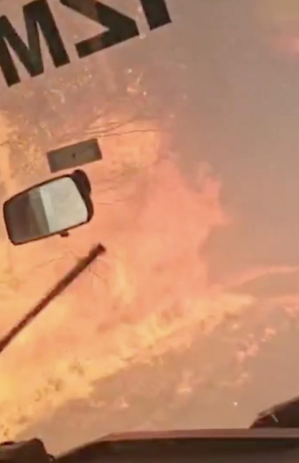 Bir anda çevresi alevlerle çevrilen itfaiye aracının içinde ölümle burun buruna anlar, kameraya yansıdı.