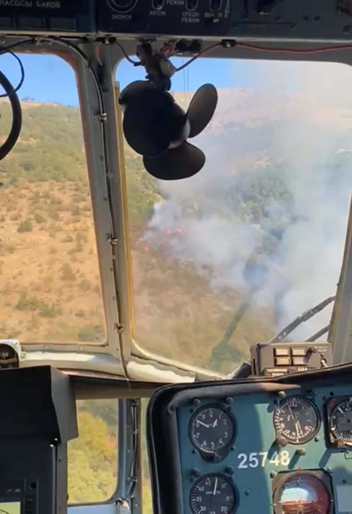 Yangının çıkış nedeni araştırılırken, sarp arazideki alevlere havadan ve karadan müdahale sürüyor.