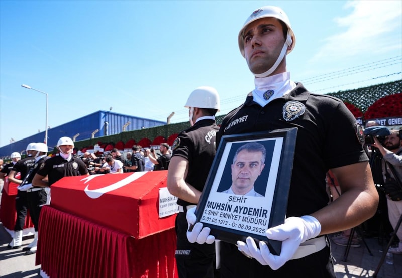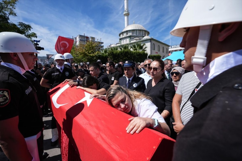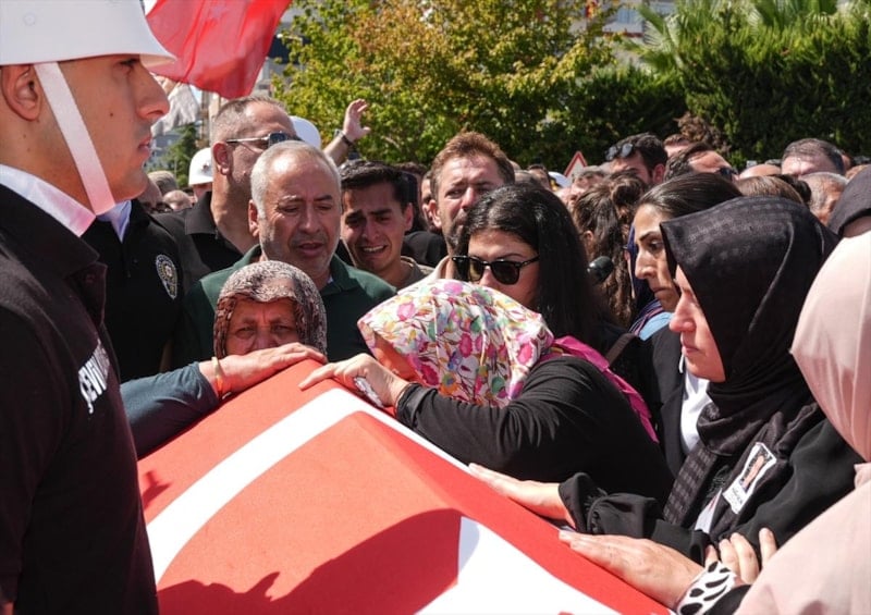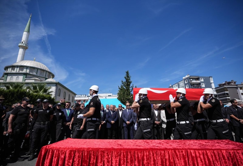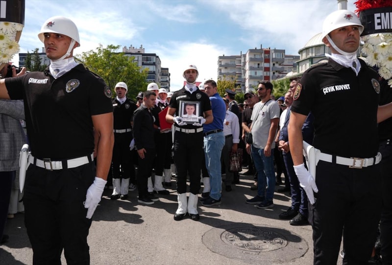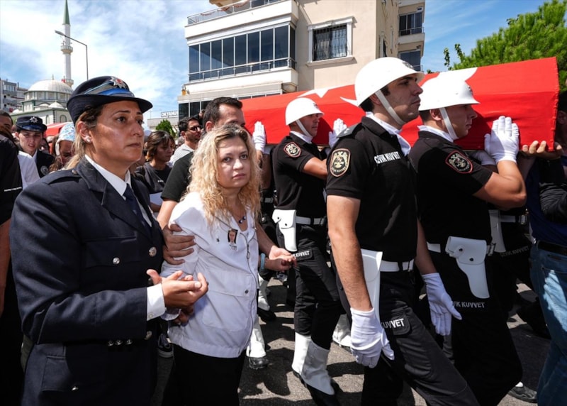 Öğle vakti düzenlenen cenaze törenine, şehitlerin ailesi ve yakınlarının yanı sıra İçişleri Bakanı Ali Yerlikaya, İzmir Valisi Süleyman Elban, Ege Ordusu ve Garnizon Komutanı Orgeneral İrfan Özsert, AK Parti Genel Sekreteri Eyyüp Kadir İnan, CHP Genel Başkan Yardımcısı Murat Bakan, AK Parti, MHP ve İYİ Parti'li bazı milletvekilleri, İzmir Büyükşehir Belediye Başkanı Cemil Tugay, Emniyet Genel Müdürü Mahmut Demirtaş, Sahil Güvenlik Hava Komutanı Tuğamiral Ertuğrul Şerbetci ile askeri erkan, siyasi partilerin temsilcileri, meslektaşları da katıldı.