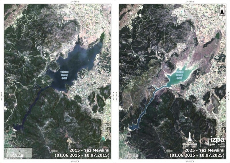 İzmir Planlama Ajansı’nın uydu görüntüleri üzerinden yaptığı analiz, 2015-2025 arasında Tahtalı Barajı yüzey alanının ciddi şekilde küçüldüğünü ortaya koydu.