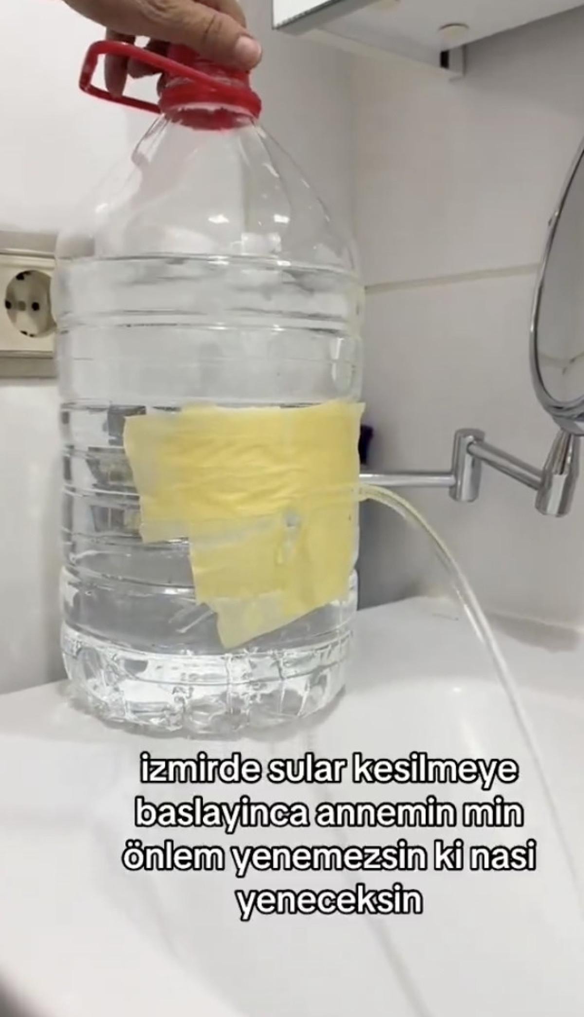 Sular kesilince damacanadan kendi musluğunu üreten kadın, İzmir'deki durumu gözler önüne serdi. Annesinin bulduğu çözümü paylaşan genç, "İzmir'de su kesilmeye başlayınca annemin önlemi." yazdı.