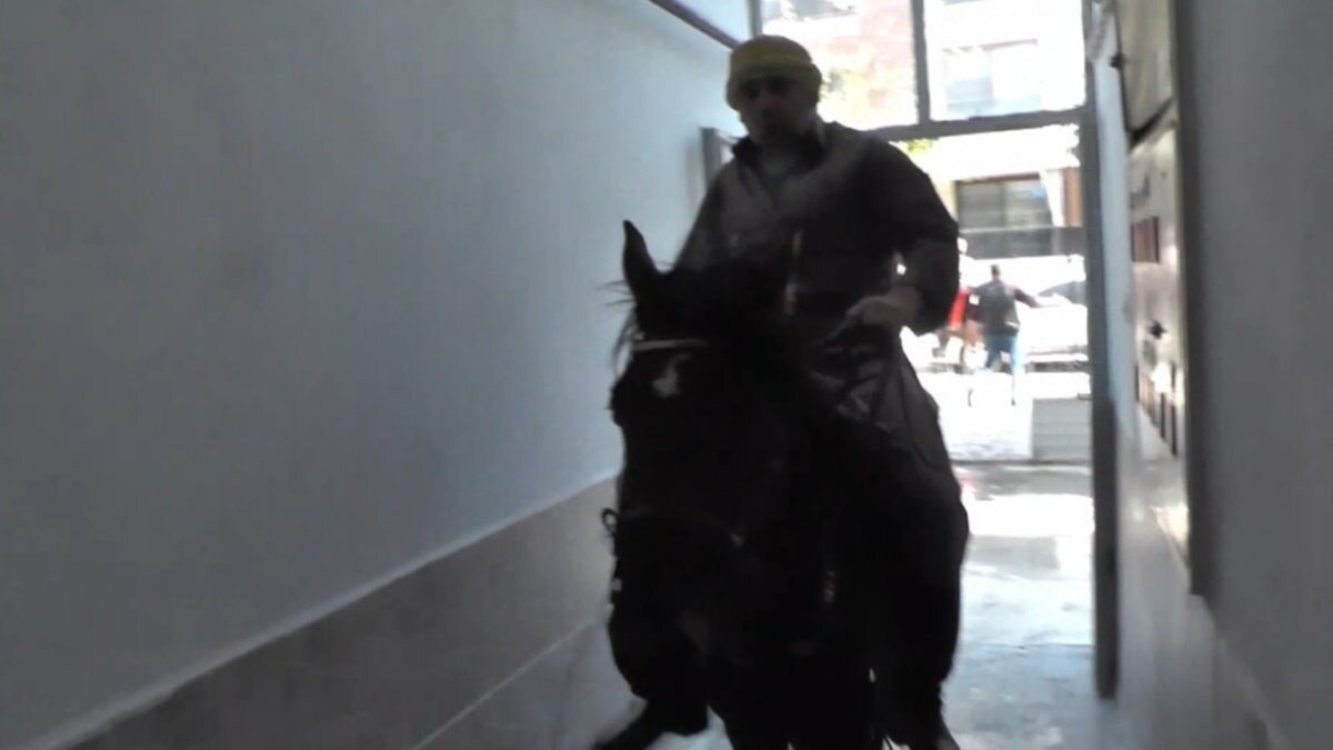 Çevredekilerin şaşkın bakışları arasında atıyla girdiği dairenin balkonuna çıkan Sıkı, izleyenleri selamlayarak yine merdivenlerden indi ve apartmandan çıktı