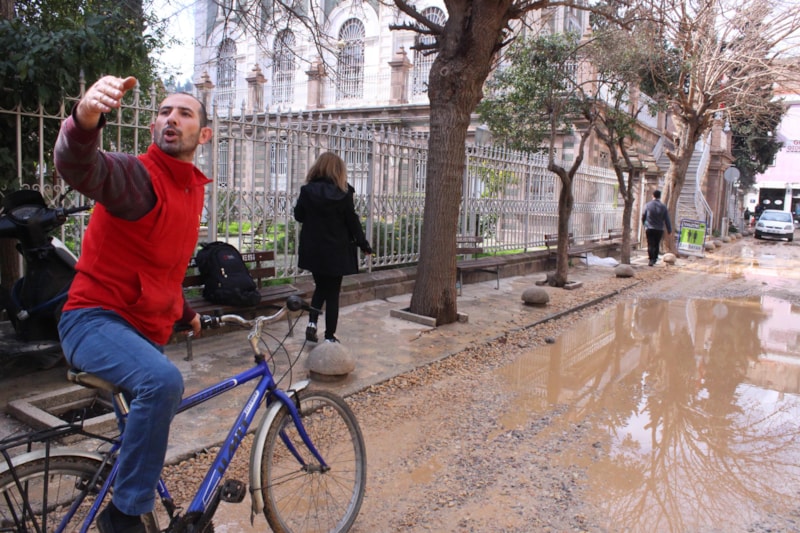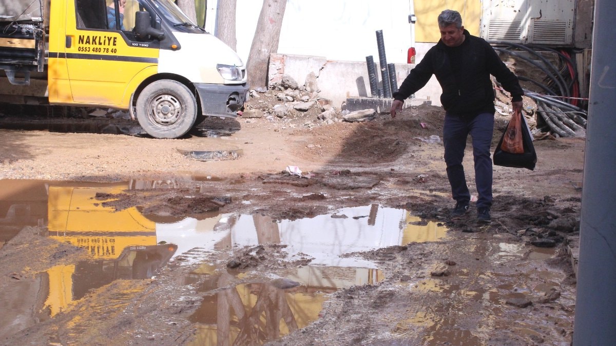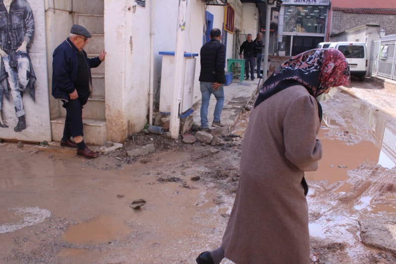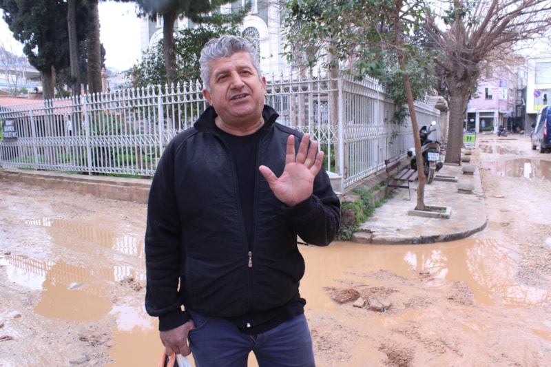"6 aydır çalışma devam ediyor. Su içerisindeyiz. Burası afet bölgesi değil ama esnaf olarak burayı afet bölgesi ilan ettik. Bebek arabaları geçemiyor, insanlar geçemiyor ve burası tarihi bir çarşı. Biz ekmek, su, para istemiyoruz. Yolumuzu yapın istiyoruz. Bu yol yüzünden kafemi kapattım. Çünkü müşteri gelemiyor. Yolu yapmak için kazdılar ama 6 ay oldu. Yetkili bir kişi gelip de bu sorundan dolayı özür bile dilemedi. Muhatabımız yok."