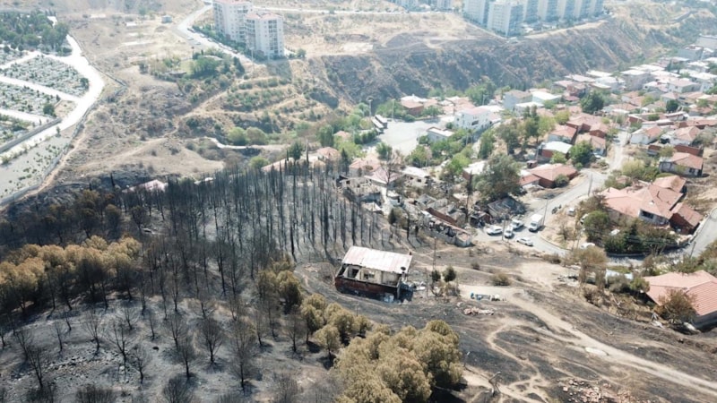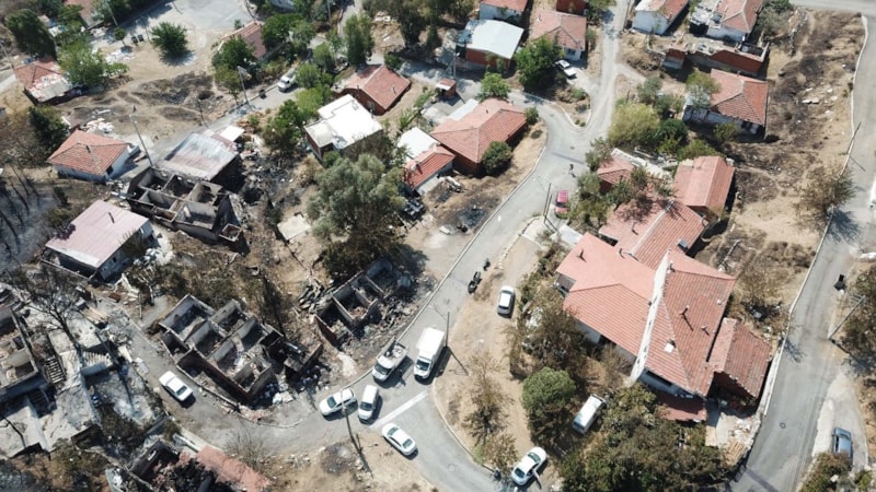 Karşıyaka ilçesindeki Yamanlar Dağı'nda 15 Ağustos'ta başlayan ve 62,5 saat sonra kontrol altına alınan yangında zarar gören 17 evin olduğu Onur Mahallesi, havadan dronela görüntülendi. Evleri yananlar, yaşadıklarını anlattı.