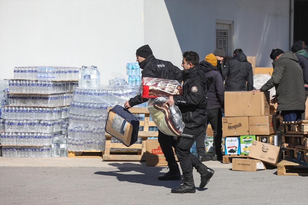 İzmir Emniyet Müdürlüğü'nde görev yapan polisler, Kahramanmaraş merkezli depremlerden etkilenenler için kendi aralarında topladıkları ve vatandaşların polis merkezlerine getirdikleri yardım malzemelerini bir araya getirdi.