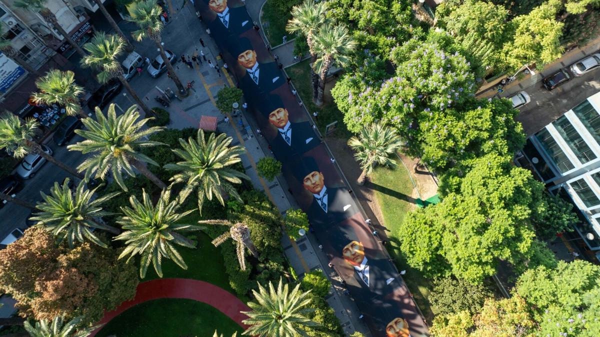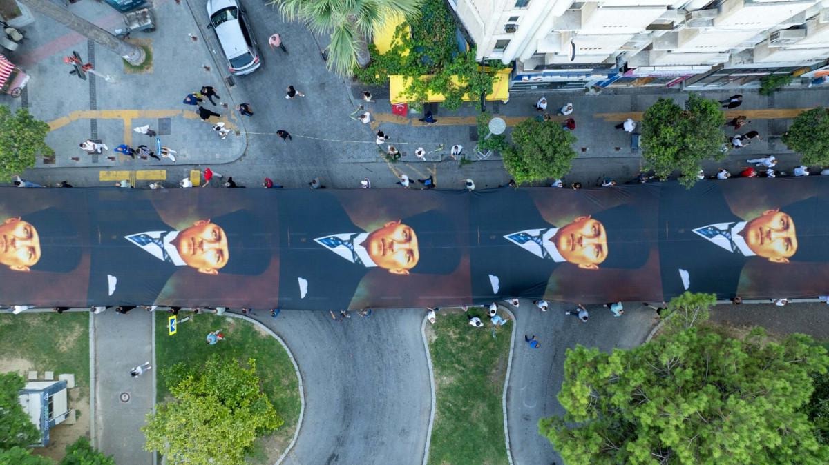 Anafartalar Caddesi ile Cumhuriyet Meydanı arasında geçen yürüyüşte 350 metrelik dev Atatürk posteri taşınırken, bando takımı da eşlik ederek renk kattı.