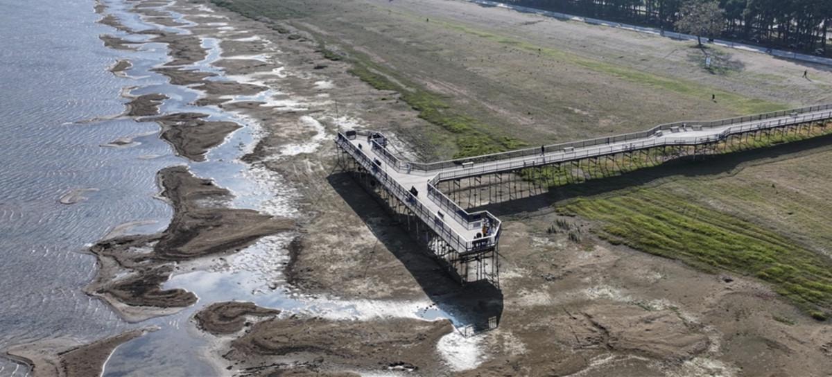 Bazı balıkçı kayıklarının karaya oturduğu gölün çevresinde, kuraklık kaynaklı küçük adacıklar oluştu.