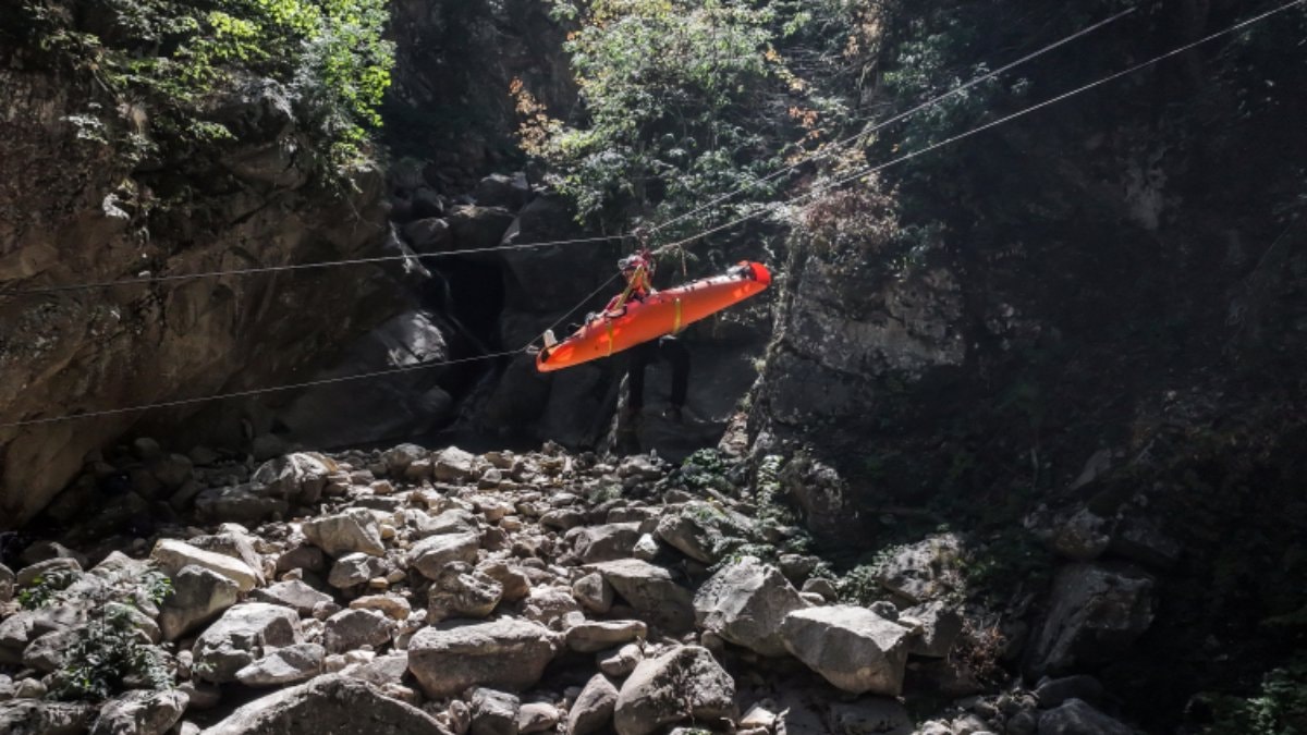 Senaryo gereği mahsur kalanların kurtarılması için sarp kayalık araziye çıkan ekipler, dağ ipleriyle kurulan havai hat ile yaralıyı yaklaşık 50 metre yükseklikten tahliye etti.