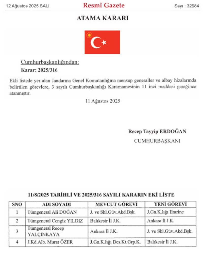 Cumhurbaşkanı Recep Tayyip Erdoğan imzasıyla yayınlanan 2025/316 sayılı karara göre, Jandarma Genel Komutanlığı’na mensup generaller ve albaylar, 3 sayılı Cumhurbaşkanlığı Kararnamesinin 11. maddesi gereğince yeni görevlerine atandı.