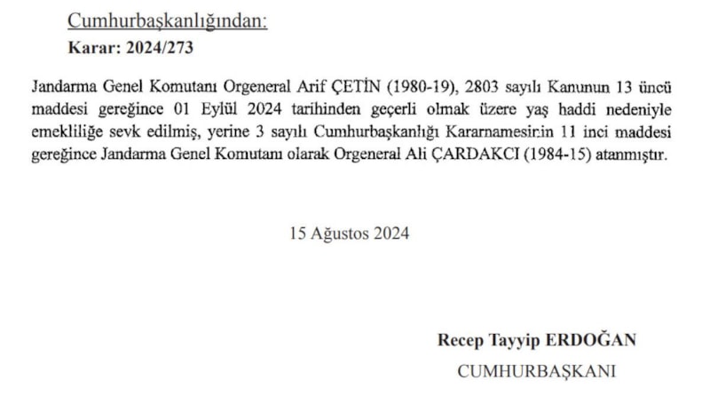 Resmi Gazete'de yayınlanan kararda "Jandarma Genel Komutanı Orgeneral Arif Çetin (1980-19), 2803 sayılı Kanunun 13 üncü maddesi gereğince 01 Eylül 2024 tarihinden geçerli olmak üzere yaş haddi nedeniyle emekliliğe sevk edilmiş, yerine 3 sayılı Cumhurbaşkanlığı Kararnamesinin 11 inci maddesi gereğince Jandarma Genel Komutanı olarak Orgeneral Ali ÇARDAKCI (1984-15) atanmıştır." ifadeleri kullanıldı.