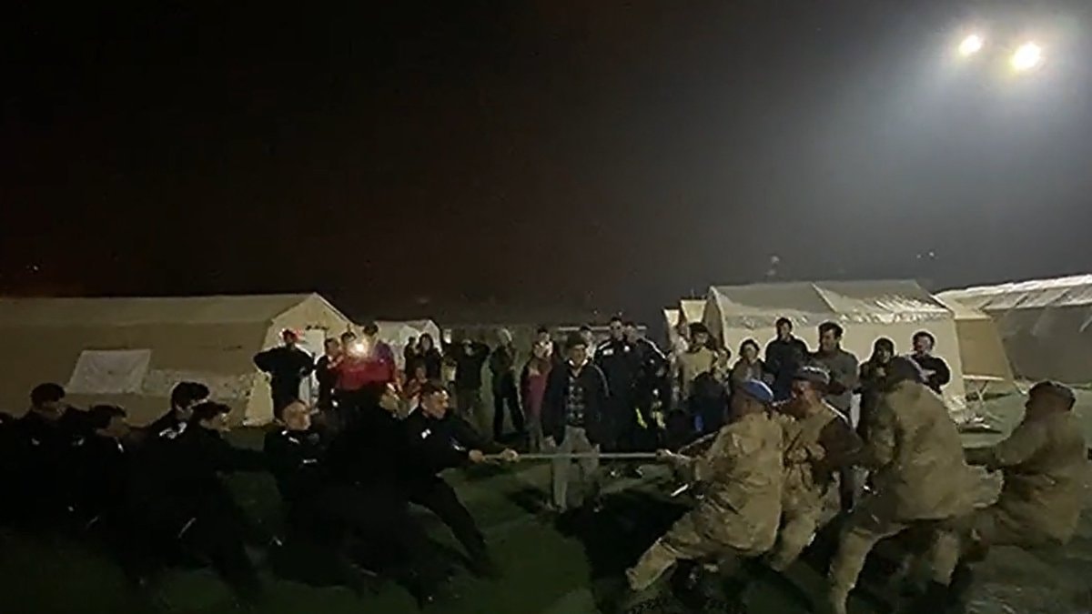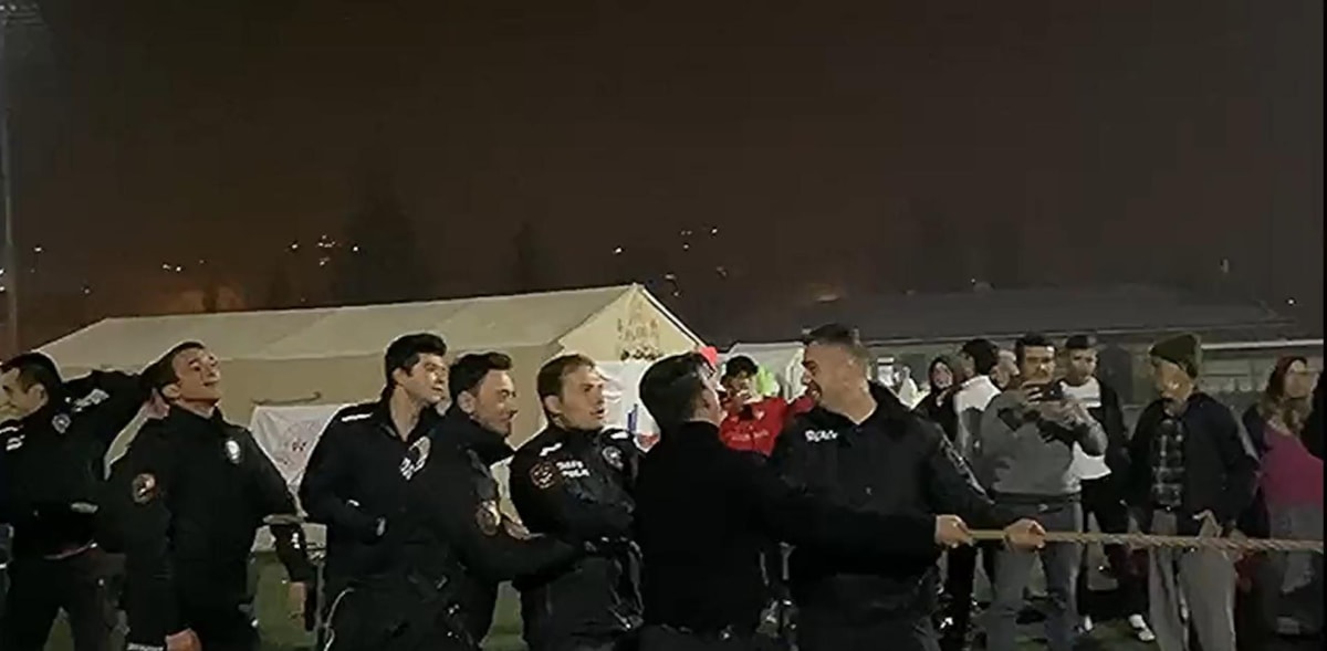 Komando ve çevik kuvvet ekibi, halat çekme oyunu oynadı. Küçükten büyüğe depremzedelerin keyifle izlediği yarışta büyük mücadele verilirken, oyunu jandarmanın kazandığı görüldü.