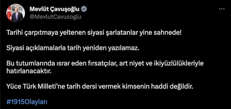 Çavuşoğlu, "Tarihi çarpıtmaya yeltenen siyasi şarlatanlar yine sahnede! Siyasi açıklamalarla tarih yeniden yazılamaz. Bu tutumlarında ısrar eden fırsatçılar, art niyet ve iki yüzlülükleriyle hatırlanacaktır. Yüce Türk Milleti'ne tarih dersi vermek kimsenin haddi değildir." şeklinde konuştu.