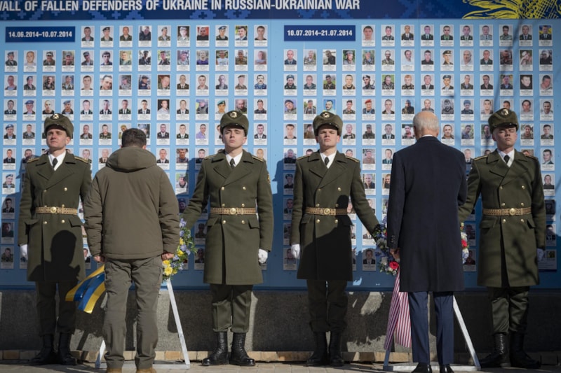 Rusya-Ukrayna savaşında hayatını kaybeden Ukraynalılar anısına kurulan anma duvarına çiçek bırakan Joe Biden, adına yapılan plaketin açılışını da gerçekleştirdi.