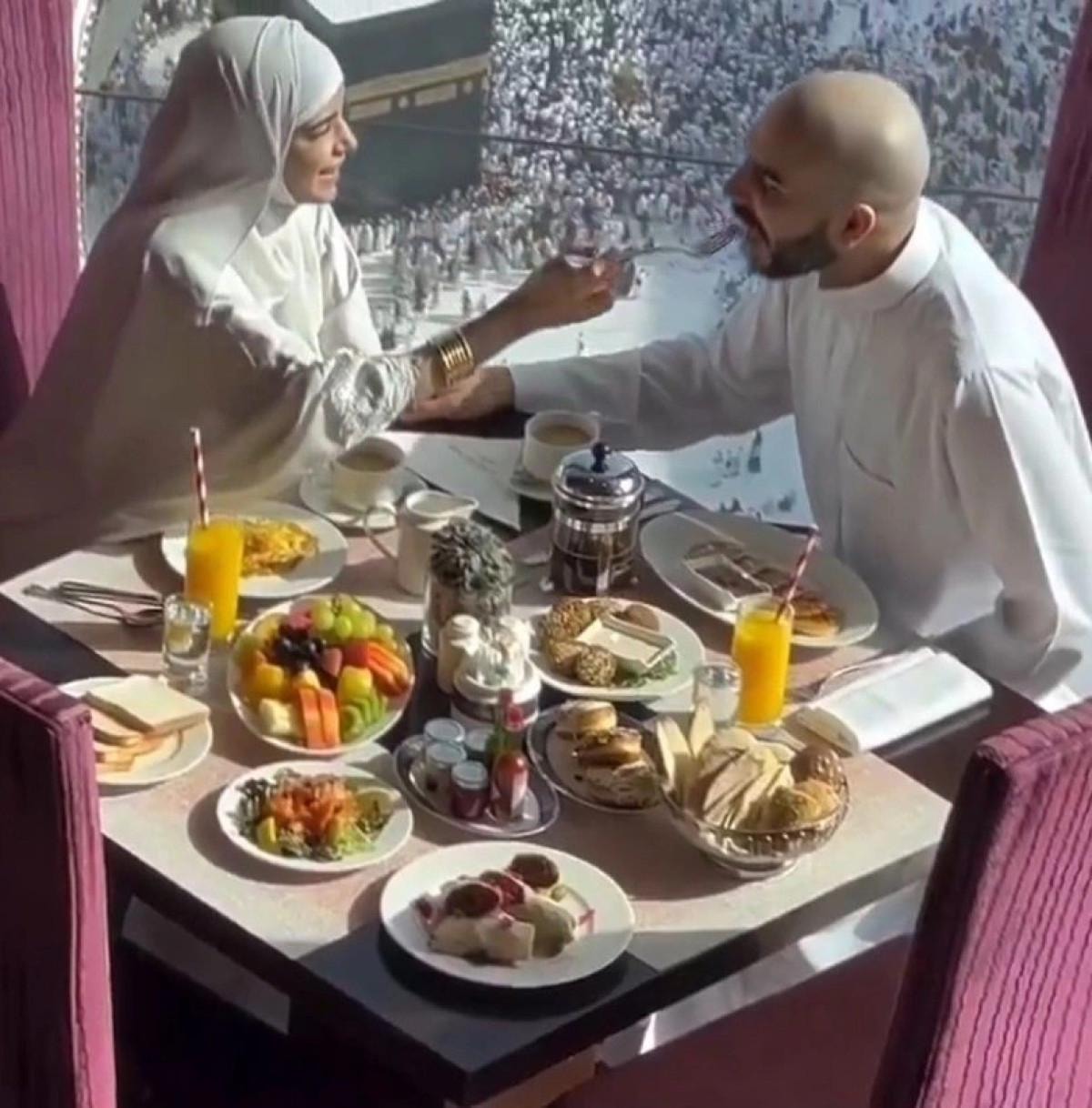 Videoda bir çiftin Kabe manzarası eşliğinde lüks bir kahvaltı yaptıkları görüldü.